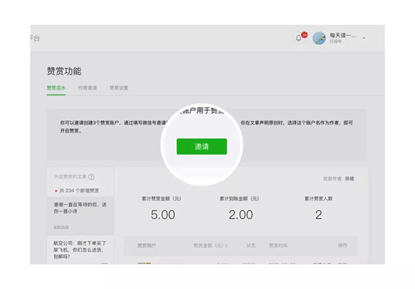 有邀請權限的公眾號在“贊賞功能”里填寫微信號發(fā)送創(chuàng)建邀請。