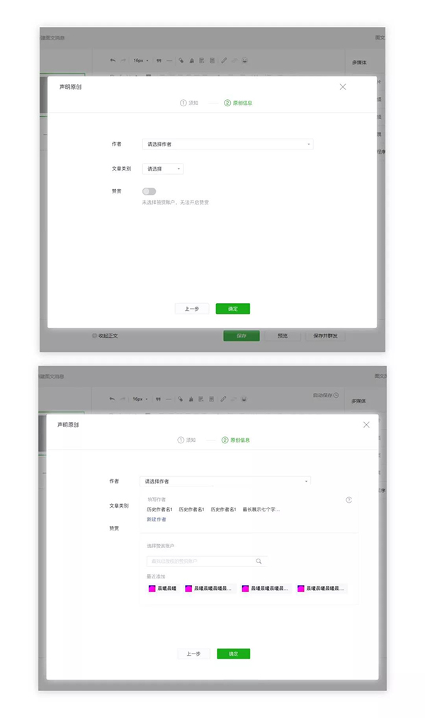 公眾號對文章聲明原創(chuàng)時,輸入贊賞賬戶名進行查找。選擇了贊賞賬戶的文章可以開啟贊賞。