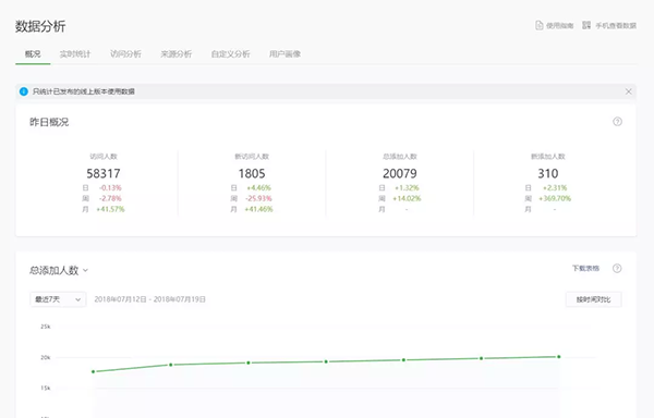在微信最新版客戶端中,用戶可將使用過的小程序添加為「我的小程序」。已面向開發(fā)者提供「我的小程序」添加數(shù)據(jù),小程序開發(fā)者可登錄微信公眾平臺(tái)或使用小程序數(shù)據(jù)助手,查看相關(guān)數(shù)據(jù)詳情: