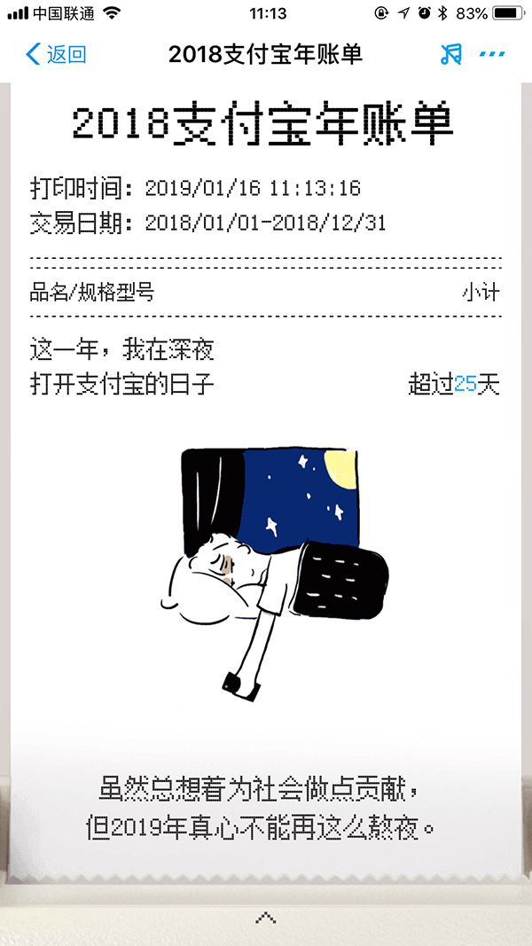 第一頁賬單統(tǒng)計了深夜打開支付的次數(shù),最后強調(diào)“2019年真心不能再這么熬夜”,關(guān)心到用戶的健康問題方面。