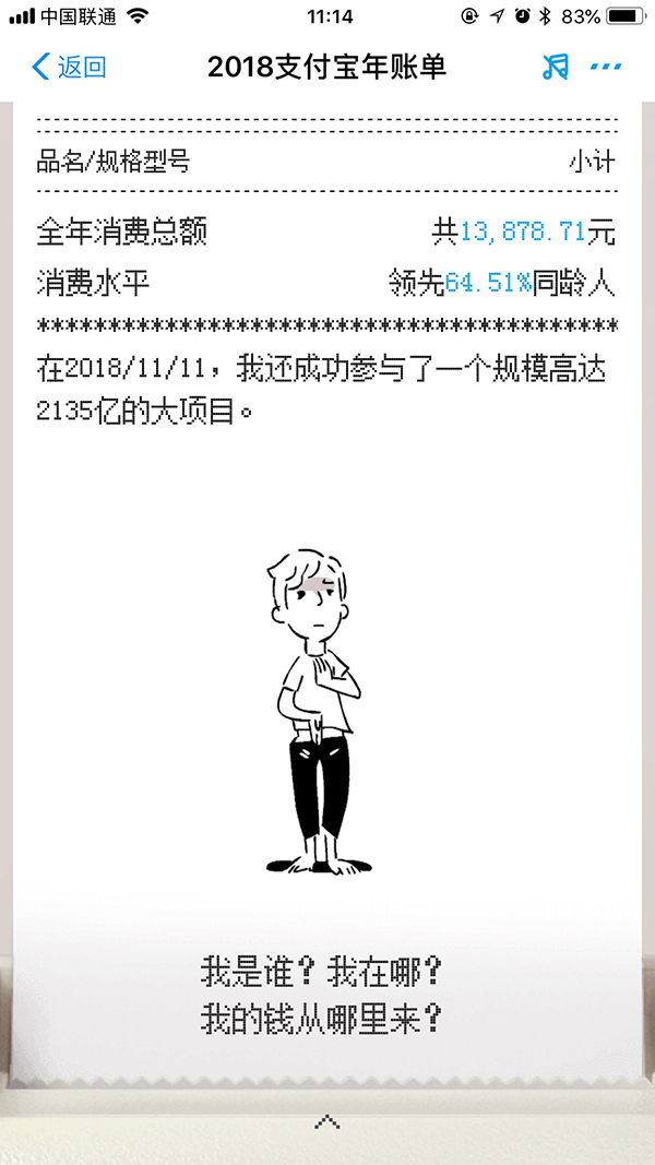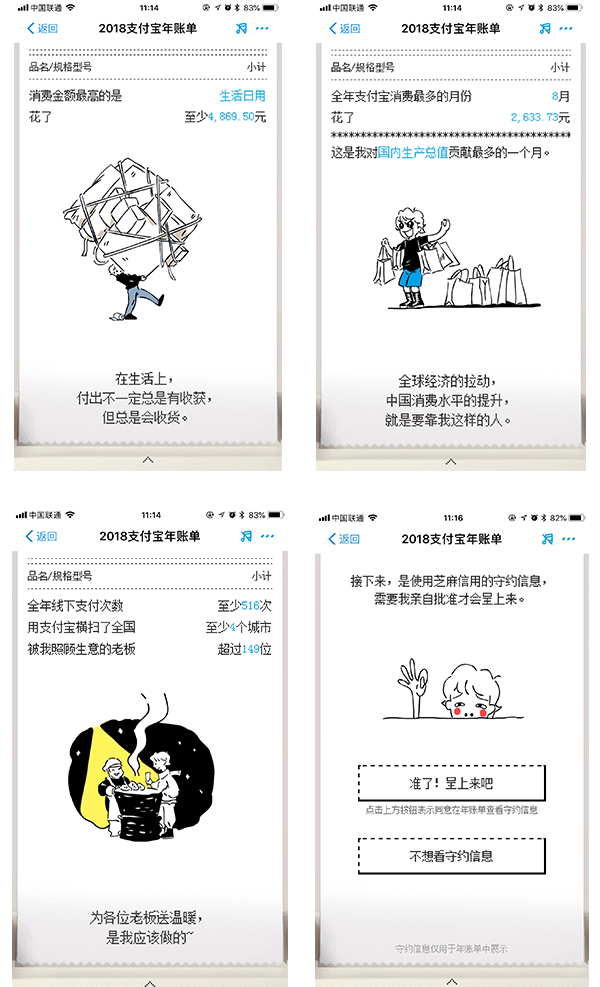 或許賬單會遲到,但卻永遠不會缺席。上周,支付寶年賬單在微信朋友圈開始雙刷屏,自覺花錢如流水的網(wǎng)友,紛紛以各種“不忍直視!”的詼諧表達來調(diào)侃自己。不過,今年的支付寶賬單與往年有所不同,2018年度支付寶賬單采用了流水小票概念設(shè)計,看上去相當有創(chuàng)意,整個賬單就像一張從打印機中慢慢打印出來的購物小票,每一頁都配有相應(yīng)的簡筆畫。