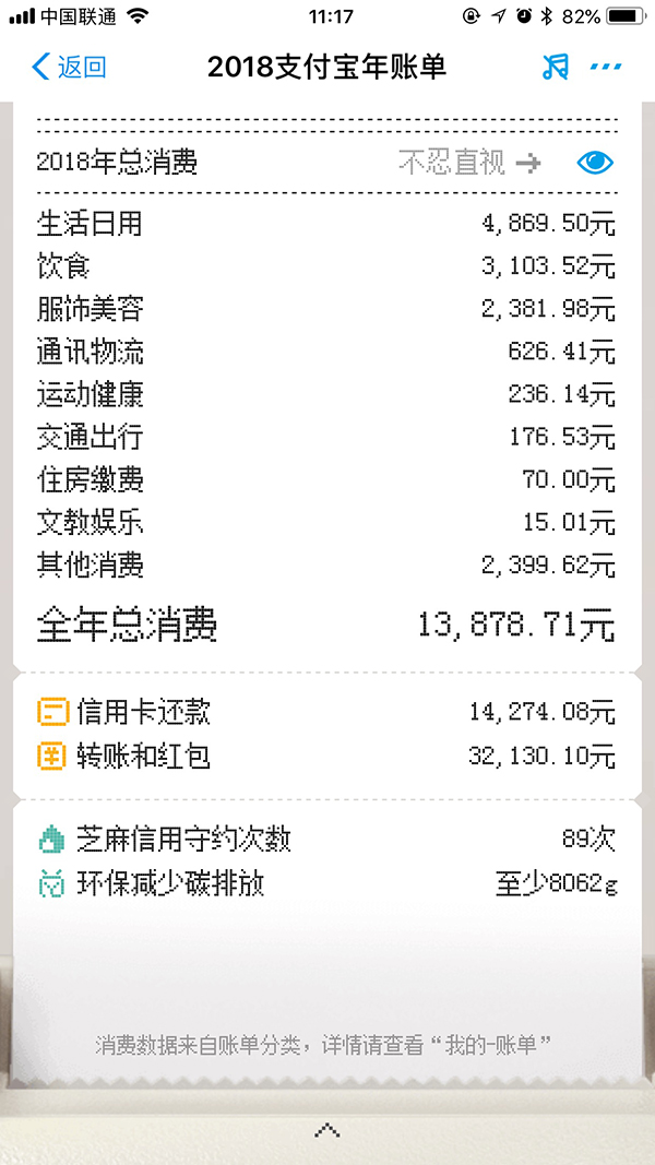 第二頁賬單統(tǒng)計了你去年一年的消費總額,以及在全國用戶中的水平,這簡直就是一年中最為富有的時刻。