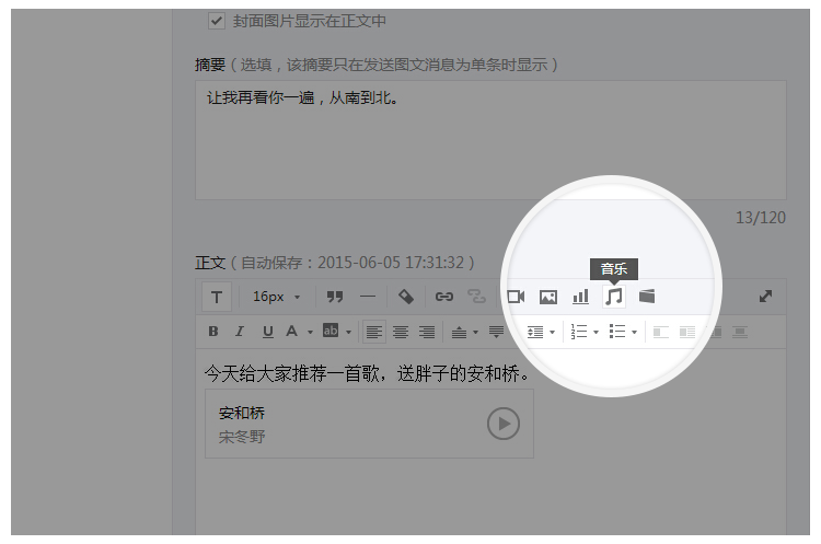 1. 運營者可以在編輯圖文消息時,在正文中插入音樂。