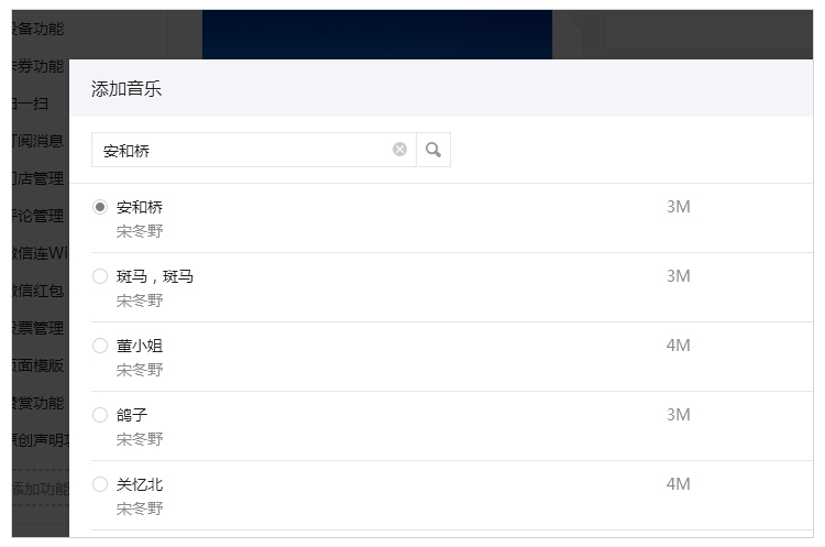 2. 選取音樂時,支持根據(jù)歌名、作者進行搜索,并且可以試聽音樂。