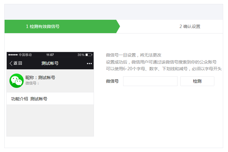 當(dāng)新帳號(hào)信息審核通過后,可在“公眾號(hào)設(shè)置”進(jìn)行微信號(hào)設(shè)置。運(yùn)營(yíng)者可先檢測(cè)預(yù)設(shè)的微信號(hào)是否可用,若可用再進(jìn)行下一步操作。此外,設(shè)置微信號(hào)時(shí),運(yùn)營(yíng)者直接可見微信內(nèi)該公眾帳號(hào)的微信號(hào)展示效果,提升用戶對(duì)微信號(hào)的理解。
