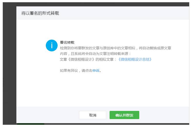 2. 設(shè)置為允許轉(zhuǎn)載的文章在群發(fā)后,其他公眾號(hào)轉(zhuǎn)載時(shí)無(wú)法修改原文章內(nèi)容及排版等,系統(tǒng)自動(dòng)為轉(zhuǎn)載文章注明出處,且將默認(rèn)所有公眾號(hào)獲得了作者的轉(zhuǎn)載授權(quán)。所有依據(jù)本功能轉(zhuǎn)載的文章,原創(chuàng)作者再行投訴轉(zhuǎn)載者抄襲侵權(quán)將不被支持。