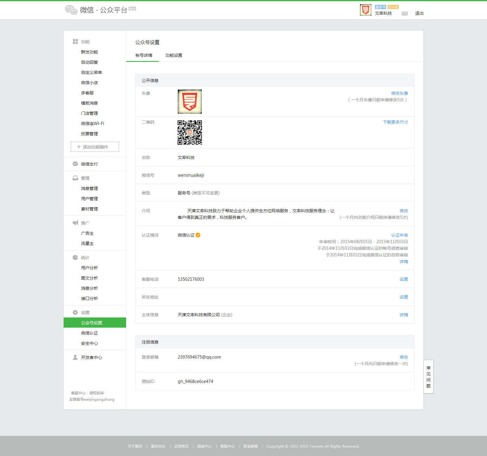 當(dāng)微信公眾號(hào)的粉絲達(dá)到一定的數(shù)量后在申請(qǐng)認(rèn)證,這樣更有利于品牌的建設(shè),也方便企業(yè)推送信息和解答消費(fèi)者的疑問(wèn),更重要的是可以借此免費(fèi)搭建一個(gè)推廣平臺(tái),但記得將您公眾帳號(hào)的頭像更換為企業(yè)LOGO或者店鋪的招牌,企業(yè)信息和相關(guān)介紹一定要填寫(xiě)詳細(xì)、仔細(xì)。如:天津網(wǎng)站建設(shè)-文率科技。
