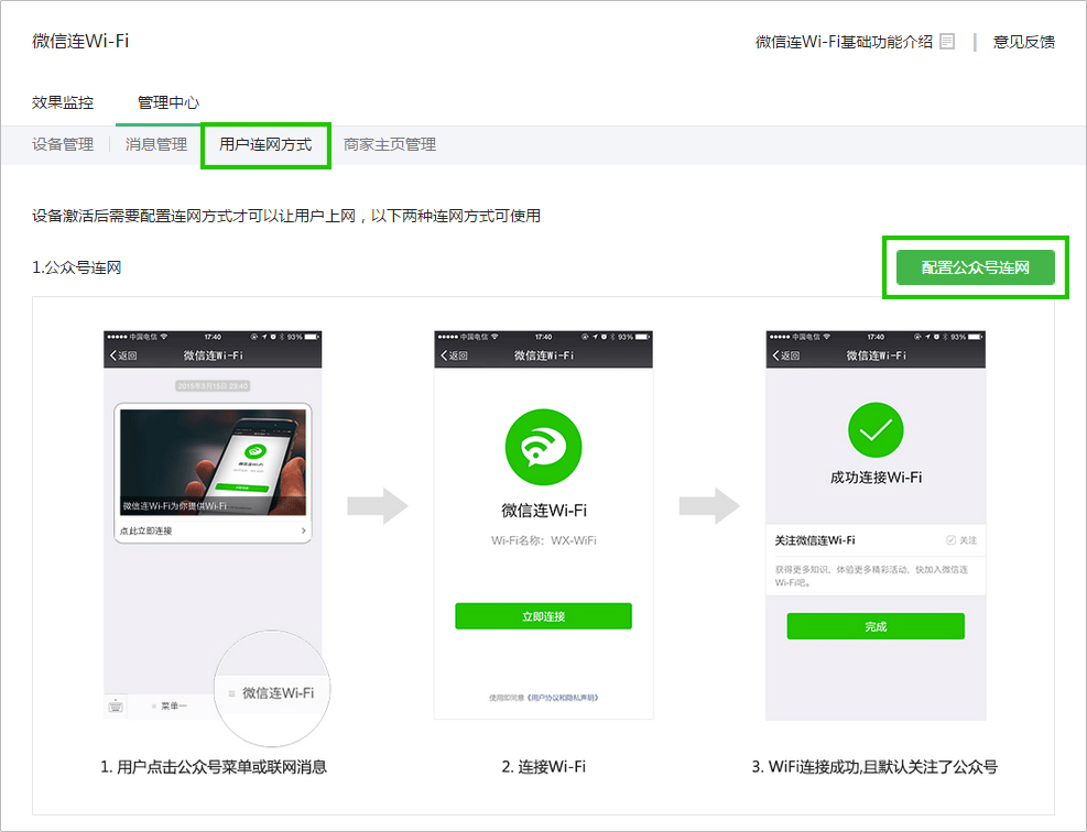 2、選擇“用戶連網(wǎng)方式”,然后點擊“配置公眾號連網(wǎng)”: