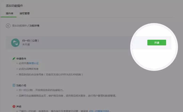 登錄微信公眾平臺(tái)-> 點(diǎn)擊左側(cè)的“添加功能插件”-> 選擇“掃一掃”-> 點(diǎn)擊“開(kāi)通”。