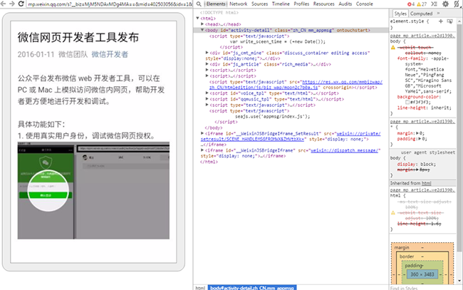 為此,微信 web 開發(fā)者工具同步推出0.5.0版本,繼支持測試號、企業(yè)號、第三方平臺開發(fā)者的使用之后,新增支持實時映射手機屏幕到 PC 或者 Mac 上,可以遠程調(diào)試 X5 Blink 內(nèi)核上的網(wǎng)頁。