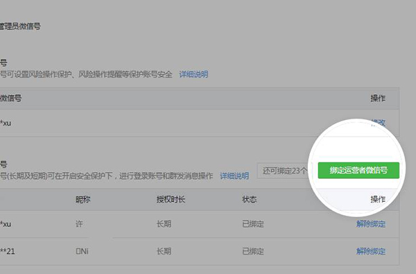 在安全中心/管理員微信號(hào)里進(jìn)行綁定并選擇授權(quán)時(shí)長。