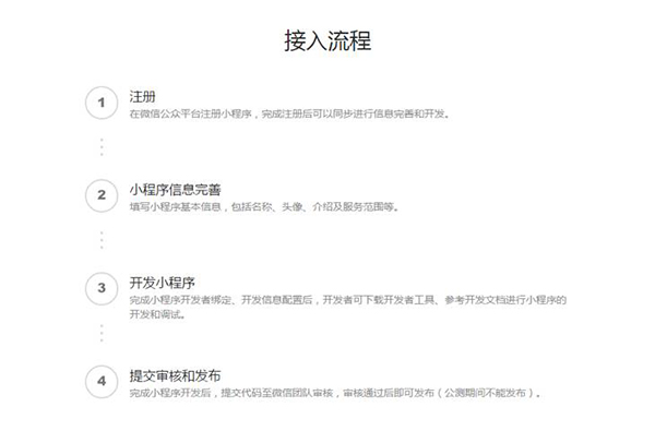 3、開發(fā)小程序:完成小程序開發(fā)者綁定、開發(fā)信息配置后,開發(fā)者可下載開發(fā)者工具、參考開發(fā)文檔進(jìn)行小程序的開發(fā)和調(diào)試。