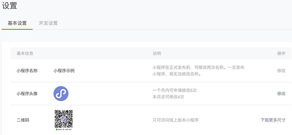 1、在“設(shè)置”中查看小程序的正式二維碼,該二維碼只用于訪問小程序的線上正式版本。