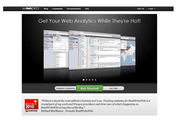 Woopra的出現(xiàn)將實(shí)時(shí)統(tǒng)計(jì)帶到了另一個(gè)層次,它能實(shí)時(shí)直播網(wǎng)站的訪問(wèn)數(shù)據(jù),你甚至可以使用Woopra Chat部件與用戶聊天。不僅如此,另外,Woopra還擁有先進(jìn)的通知功能,可讓你建立各類通知,如:電子郵件、聲音、彈出框等。