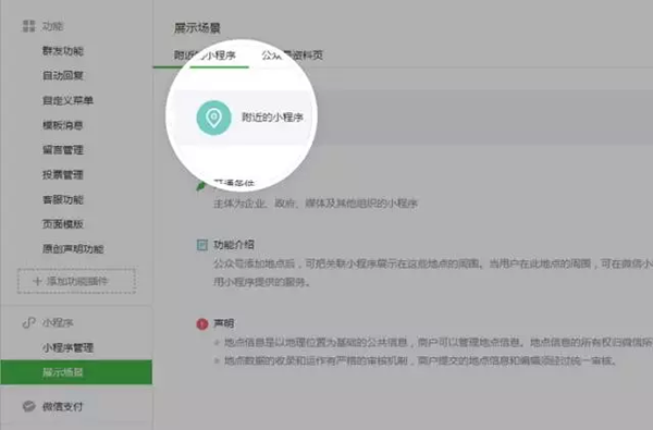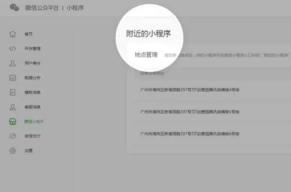 公眾號(hào)后臺(tái)新增附近的小程序功能,申請(qǐng)開(kāi)通后支持添加地點(diǎn)。