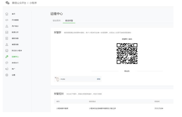 在運維中心,開發(fā)者可掃描二維碼加入小程序報警群。當(dāng)小程序在運行中出現(xiàn)問題時,系統(tǒng)會推送信息告知報警群內(nèi)的成員。