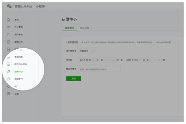 為了幫助開發(fā)者及時發(fā)現(xiàn)小程序運行中出現(xiàn)的問題,公眾平臺新增小程序運維中心。開發(fā)者可以在運維中心查詢小程序最近30天內(nèi)出現(xiàn)的錯誤信息,快速修復(fù)問題。