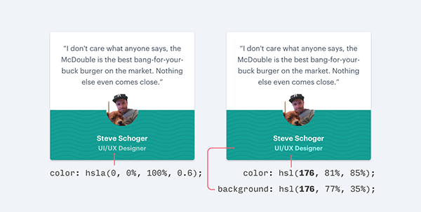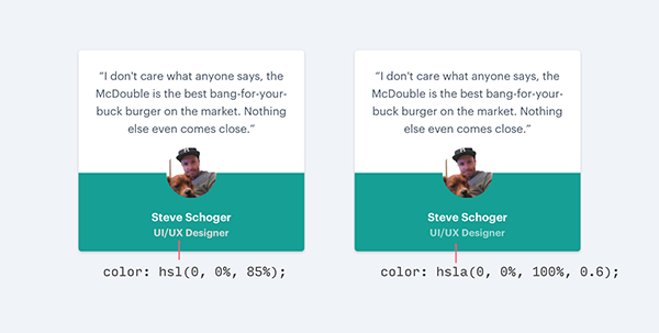 在白色背景下,合理的淡化視覺效果的做法是將黑色文本改成灰色,但這種方式在 彩色背景下并不適用。實(shí)際上,在白色背景下文本由黑變灰是為了降低對(duì)比度,但在彩色背景下,想要降低對(duì)比度是應(yīng)該讓文本逐步接近背景色,而并非改成灰色,若想要降低和背景色之間的對(duì)比,通常采用如下方式: