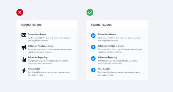 這樣做不僅能讓圖標(biāo)達(dá)到預(yù)期的視覺體積,而且看起來效果更佳,當(dāng)然,如果你手頭不是那么緊的話,較好還是買幾個(gè)大尺寸的高素質(zhì)圖標(biāo),比如 Heroicons 或 Iconic。