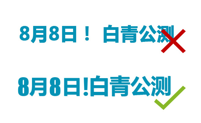 上圖打叉的是我們經(jīng)常忽略的小細(xì)節(jié),用系統(tǒng)默認(rèn)字體的大小打完專題,你會(huì)發(fā)現(xiàn)其實(shí)中文和英文的大小是不一樣的,上圖數(shù)字“8”相比較“月”和“日”明顯略小,這樣,標(biāo)題會(huì)有種上下起伏的感覺,不穩(wěn)當(dāng),第二個(gè)是字的間距,默認(rèn)打完嘆號(hào)離文字過遠(yuǎn),直接斷開了2句話,有必要去調(diào)整下字的間距,調(diào)整后字號(hào)也變得更大空間得到合理運(yùn)用!
