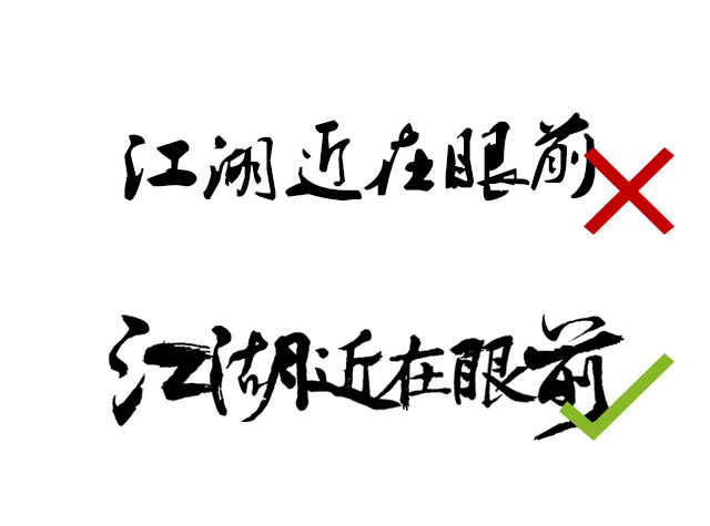 錯(cuò)誤的示意里我們選用了一款常用的書法字體,當(dāng)然結(jié)果是不理想的,也許項(xiàng)目會(huì)反饋你不夠大氣,無(wú)論在筆觸上,字形上都不是一個(gè)很好的選擇,但是現(xiàn)有的字體無(wú)法滿足你的要求,怎么辦,你可以利用一些在線書法生成一些毛筆字,但是要注意的是生成的很多字在筆觸粗細(xì)上都不一樣,很容易讓你幾個(gè)字放在一起看著很別捏,如果你沒有很好的書法基礎(chǔ),你需要多下載一些書法筆觸,找出一些字特點(diǎn)并移植到你選中的另外幾個(gè)字上,在適當(dāng)?shù)牡胤郊哟止P觸,這也是一個(gè)慢慢磨的過程,但是能提高不少作品的品質(zhì)感!