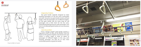 長度不一的扶手設(shè)計(jì),在國內(nèi)很多的乘客應(yīng)該也已經(jīng)發(fā)現(xiàn),其實(shí),這一設(shè)計(jì)最早是在2010年的德國紅點(diǎn)設(shè)計(jì)中早有體現(xiàn),「Press, Change Length」是一個(gè)可調(diào)節(jié)長度的拉手,由中國學(xué)生設(shè)計(jì),出發(fā)點(diǎn)是為了讓身高不同的乘客以更舒服的姿勢握著扶手站立。在日本,這種設(shè)計(jì)被譽(yù)為「貧困」的美學(xué)—用最簡單的東西創(chuàng)造一種深入人心的生活方式,有時(shí),不得不說懂得運(yùn)用設(shè)計(jì)結(jié)果比設(shè)計(jì)過程更加重要。
