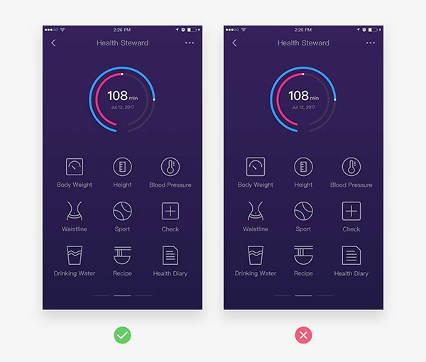 統(tǒng)一的圖標(biāo)可以提升產(chǎn)品的品質(zhì)感、信賴感,并且同一屬性的圖標(biāo)如果保持樣式上的統(tǒng)一可以降低用戶認(rèn)知成本,提升用戶的使用產(chǎn)品時(shí)的效率。由于應(yīng)用界面設(shè)計(jì)中,功能圖標(biāo)不是單獨(dú)的個(gè)體,都是一系列,但這些組合在一起代表產(chǎn)品的調(diào)性,所以具有相同的風(fēng)格,其中包括造型規(guī)則、圓角大小,線框粗細(xì),圖形樣式和個(gè)性細(xì)節(jié)等元素都應(yīng)該具有統(tǒng)一的規(guī)范。