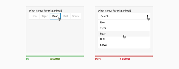 當(dāng)表單中需要選取不同選項(xiàng)時(shí),低于6個(gè)選項(xiàng)就就不需要使用下拉選項(xiàng)來(lái)選取了,因?yàn)橄吕x項(xiàng)是需要兩次點(diǎn)擊完成結(jié)果的選擇,而直接選擇來(lái)的更快。另外,若超過(guò)25個(gè)選項(xiàng),則不能僅僅使用下拉菜單選擇器,還要在下拉列表中結(jié)合上下文進(jìn)行搜索。