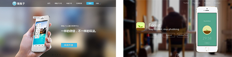二、目前,一些抽象隱晦的、大尺寸的、虛化或模糊的圖也隨處可見(jiàn)。但是使用虛化或模糊圖的情況會(huì)有些復(fù)雜。它只有在圖片本身品質(zhì)很好的情況下才會(huì)帶來(lái)好的效果,如果為了掩飾圖片質(zhì)量的低劣而去虛化,效果會(huì)適得其反。所以我們必須得清楚為什么要把圖片虛化,比如天津網(wǎng)站設(shè)計(jì)——文率科技做的微瓶子這個(gè)網(wǎng)站需要非常明顯的虛化后才有更好的效果,而Forest 這個(gè)網(wǎng)站只需要把人的寫(xiě)實(shí)背景輕微虛化就可以了。