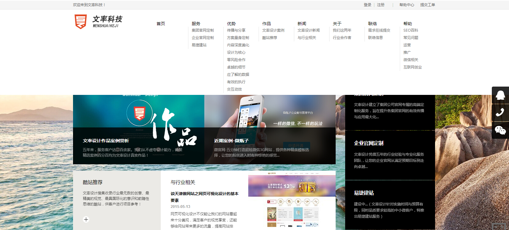 網(wǎng)站導(dǎo)航的設(shè)計要么千篇一律,沒有絲毫新意;要么千奇百怪,讓人無法理解;專注網(wǎng)站的網(wǎng)站導(dǎo)航設(shè)計應(yīng)該站在客戶和企業(yè)的角度之上綜合進(jìn)行考慮。首頁banner部分可讀信息過少等這些問題從優(yōu)化角度分析都是網(wǎng)站制作所忽視的問題。大家可以看下天津網(wǎng)站制作——文率科技的網(wǎng)站導(dǎo)航和首頁banner的設(shè)計簡單大方可讀信息多,非常有利于用戶體驗,同時很容易被百度蜘蛛抓取。