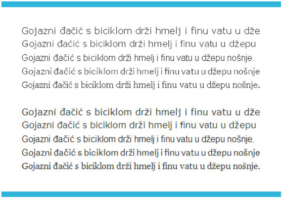 另外一個(gè)重要的易讀性測(cè)試是為了區(qū)分簡(jiǎn)單字體字形之間的區(qū)別。設(shè)計(jì)師使用全字母短句,或測(cè)試短語(yǔ)來(lái)評(píng)估和對(duì)比字體。比如有名的短語(yǔ)“The quick brown fox jumps over the lazy dog”、“Handgloves”、“Hamburgefonstiv”。