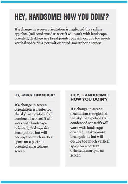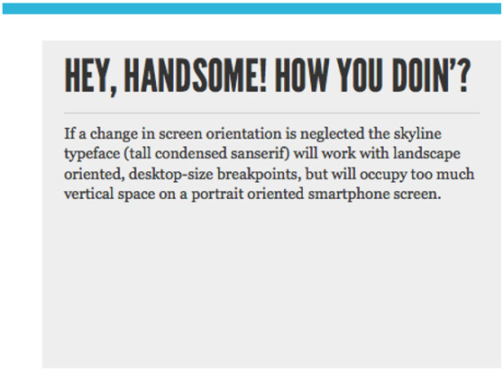 如果忽略屏幕方向和屏幕分辨率的變化,那么頂端skyline由多個(gè)字詞組成的標(biāo)題(比如說(shuō)瘦長(zhǎng)的無(wú)襯線字體)應(yīng)該能夠?qū)M向電腦桌面大小的節(jié)點(diǎn)起很好的作用,但在智能手機(jī)直式方向上可能會(huì)占用太多垂直空間,尤其是原文一行的標(biāo)題在智能機(jī)上要轉(zhuǎn)成兩行。雖然調(diào)小字體大小來(lái)調(diào)整有一定作用,但是效果未必能比在臺(tái)式電腦的文本清晰。