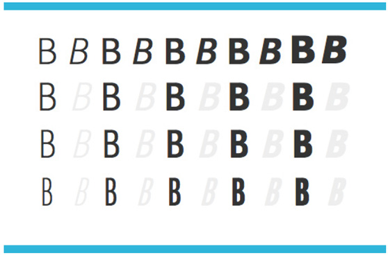 JAF Bernino Sans 有不同的粗細(xì)度和寬度。淡化的字母并非真正的斜體,被稱(chēng)為斜羅馬字體。有的瀏覽器在用CSS快速寫(xiě)入時(shí)能夠使字體變斜。但偽斜體很多時(shí)候都被看作違反排版規(guī)則的字體。