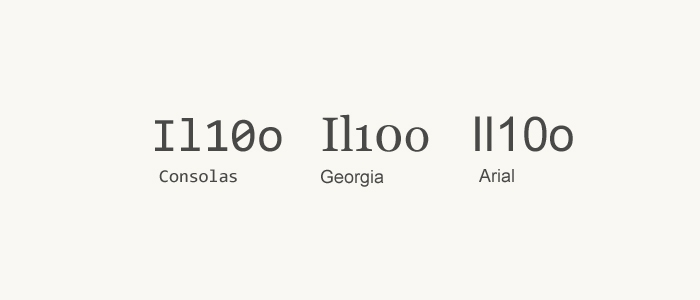 在Arial字體中,i,l 的辨識度很低,而且當(dāng)有連續(xù)的il等較窄文字出現(xiàn)時,文字難以選中。此外Georgia中,字母o,與數(shù)字0 只在大小上略有區(qū)別,基本上分不清,很難做到一目了然。由此可見,等寬字體受字母本身的干擾較小,字母大小固定,密度固定,此類字體,簡單容易辨認(rèn),大大提升了閱讀效率。