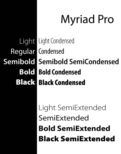 五、比例:比例變化會使家族里出現(xiàn)“瘦”和“胖”的變異,這是對字形橫向或縱向比例的收縮變化,在西文的傳統(tǒng)系統(tǒng)命名中通常會用Condensed(橫向壓縮)和Extended(橫向拉伸)來區(qū)分長和寬兩個類別,這兩種變化可以比較好的處理當(dāng)空間收到局限時字體的應(yīng)用,而不會讓字體出現(xiàn)因為進行直接的縮放所而導(dǎo)致的風(fēng)格變形。