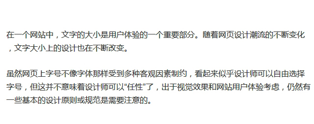 行寬:大家可以試著想像一下,如果一行文字過長,視線移動距離長,很難讓人注意到段落起點和終點,增加閱讀的難度;如果一行文字過短,眼睛需要不停的來回掃視,就會破壞閱讀節(jié)奏。因此我們可以讓內(nèi)容區(qū)的每一行承載合適的字?jǐn)?shù),來提高易讀性,傳統(tǒng)圖書排版每行最佳字符數(shù)是55-75,實際在網(wǎng)頁上每行字符75-85更流行,中文在14號字體時,建議35-45個文字。