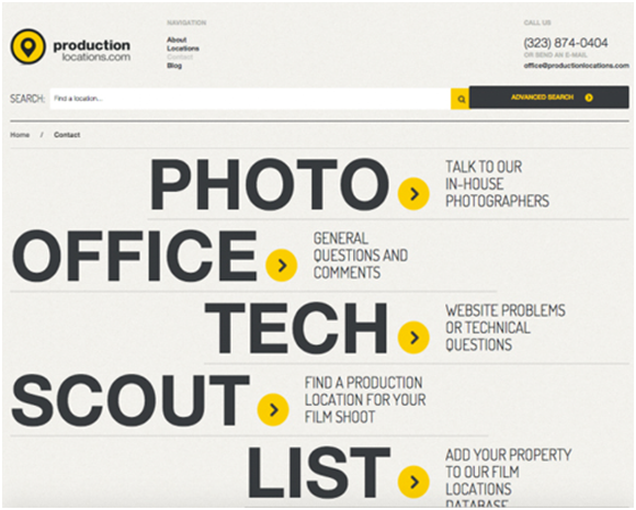 看起來好看的網(wǎng)頁頁面設(shè)計并不能說是一個成功的網(wǎng)站設(shè)計,最主要的是能夠迎合用戶,能夠有良好的用戶體驗,是屬于用戶友好型的。如:Productiong Location的聯(lián)系我們頁面采用了大膽而視覺化的頁面設(shè)計,但是和其他的同類頁面不同的是,它簡化了溝通流程,把用戶可能會關(guān)注的內(nèi)容和需要溝通的具體部分都劃分了一下,讓不同需求的用戶直接被引導(dǎo)到特定的頁面和部分,從而達成簡化和分流的目的。