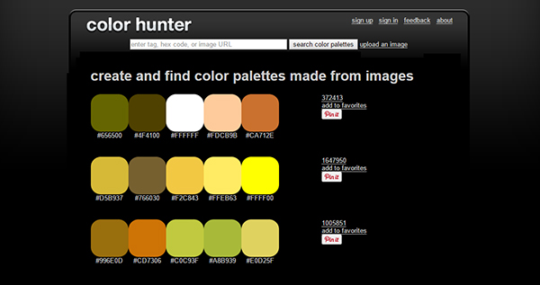 ColorHunter在線配色篩選工具是一個(gè)可以按照?qǐng)D片來自動(dòng)生成相應(yīng)的不同調(diào)色板,也就是配色方案。如果你想尋找某種風(fēng)格的配色方案,可以在網(wǎng)站上方的搜索區(qū)域進(jìn)行相應(yīng)的搜索。除了根據(jù)圖片來尋找配色外,你還可以輸入tag名稱、16進(jìn)制顏色值或Flickr網(wǎng)站中的照片(圖片)網(wǎng)址進(jìn)行搜索。