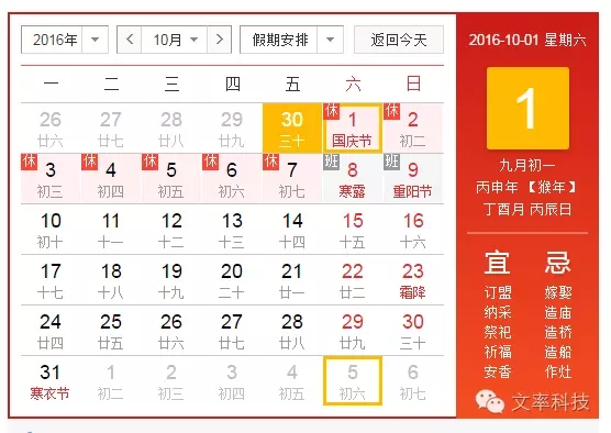 根據(jù)《國務(wù)院關(guān)于2016放假安排表的通知》,天津網(wǎng)站建設(shè)-文率科技2016十一放假時(shí)間安排:放假7天,即10月1日至10月7日。10月8號(星期六),10月9號(星期天)正常上班。