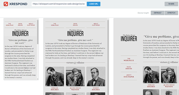 Xrespond絕對對得起“虛擬設(shè)備實驗室”,這個稱號,通過Xrespond 打開網(wǎng)頁,你可以看到它在不同屏幕尺寸下的樣子,整個布局是橫向的,所以你需要橫向滾動頁面才能看到它所有的樣子。屏幕上方的標(biāo)簽會標(biāo)識出它是為什么設(shè)備所匹配的,在下拉框當(dāng)中能夠選出不同品牌不同型號的智能手機、平板和筆記本屏幕,以預(yù)覽效果。