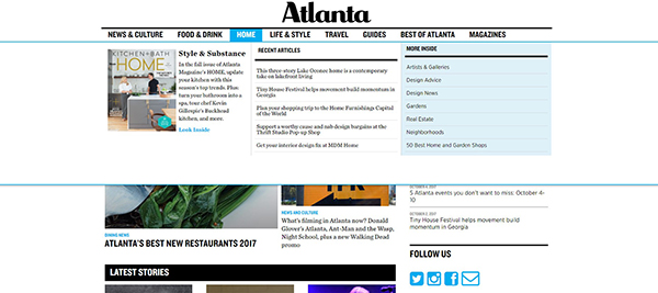 如:Atlanta Magazine這個網(wǎng)站的大型導(dǎo)航菜單給人的體驗就非常流暢,下拉菜單中嵌入了大量的鏈接,另外由于響應(yīng)式的滑動導(dǎo)航在移動端上也已經(jīng)很常見了,這使得它還輕松兼顧到了移動端的設(shè)計。